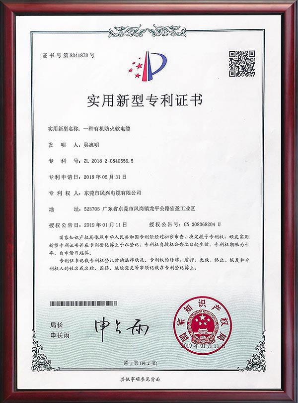 • 专利证书-一种有机防火软电缆-2019