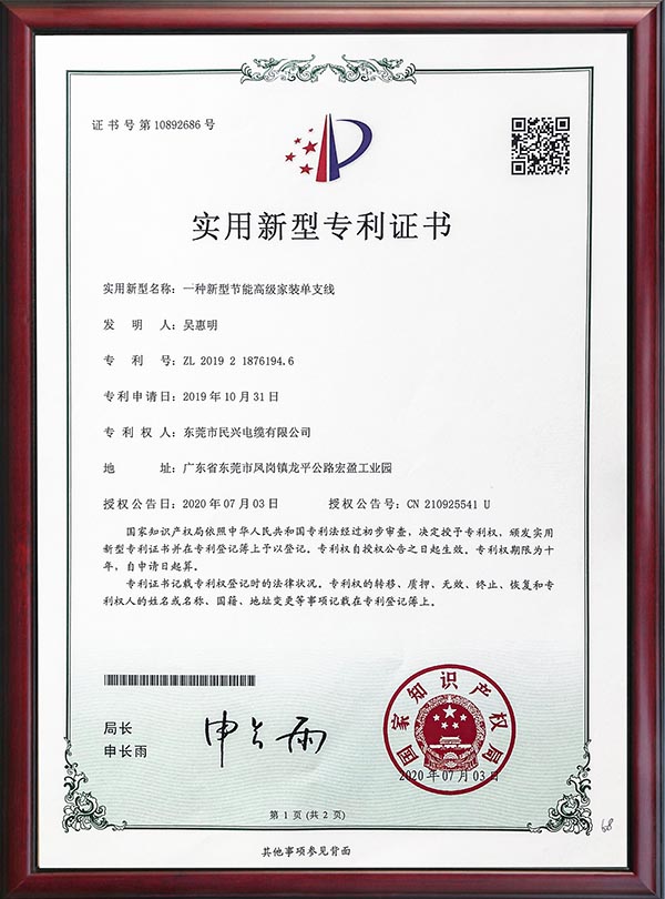 • 专利证书-一种节能高阻燃家装软线