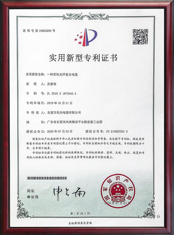 • 专利证书-一种柔性光纤复合电缆