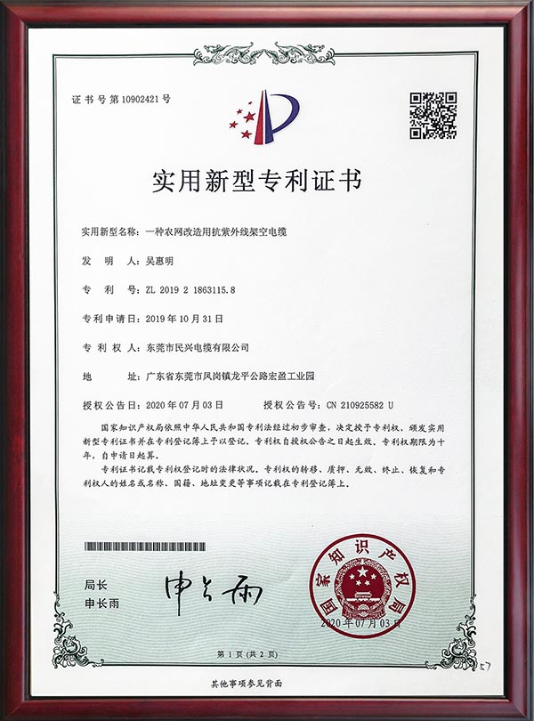 • 专利证书-一种农网革新用抗紫外线架空电缆