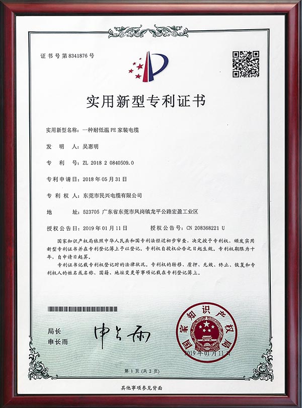 • 专利证书-一种耐低温PE家装电缆-2019