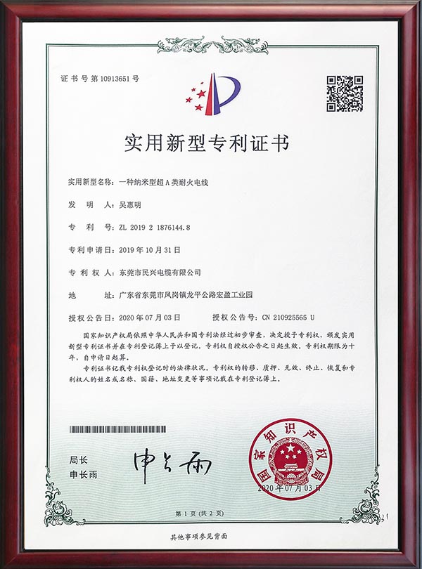 • 专利证书-一种纳米型超A类耐火电线