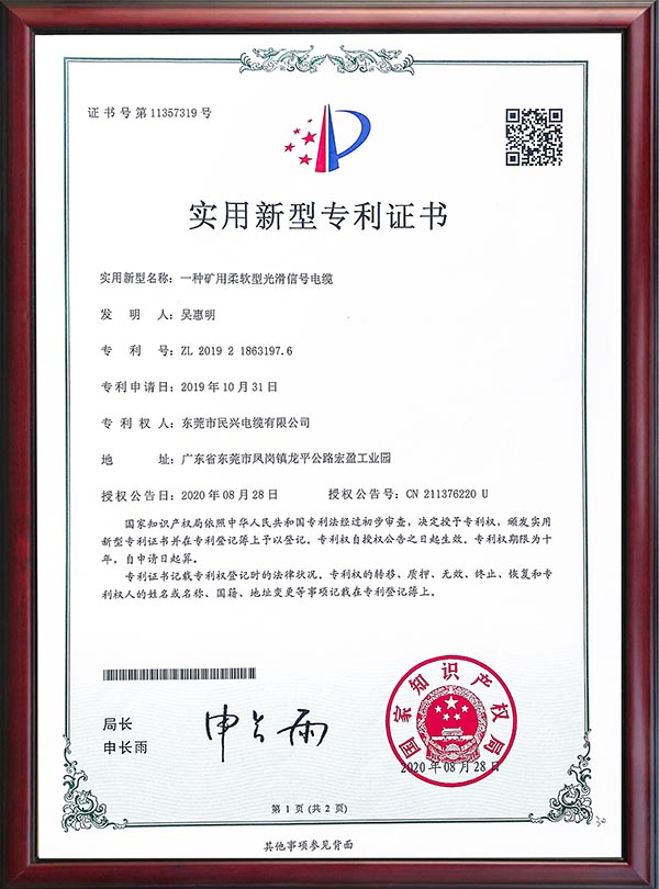 • 专利证书-一种矿用柔软型平滑信号电缆