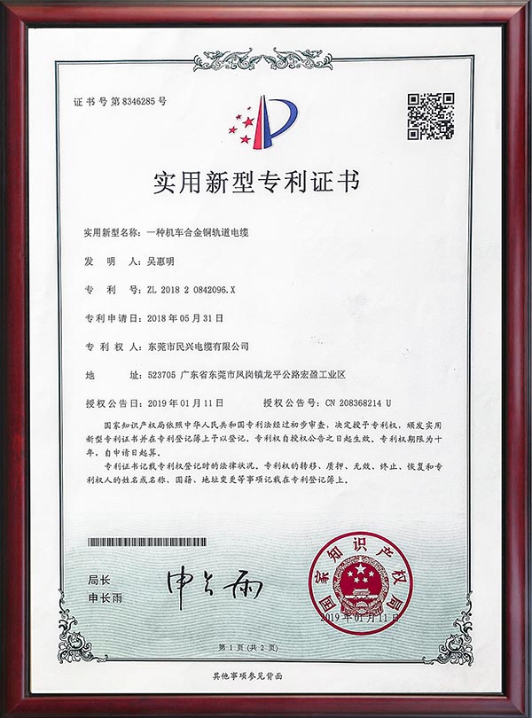 • 专利证书-一种机车合金铜轨道电缆-2019