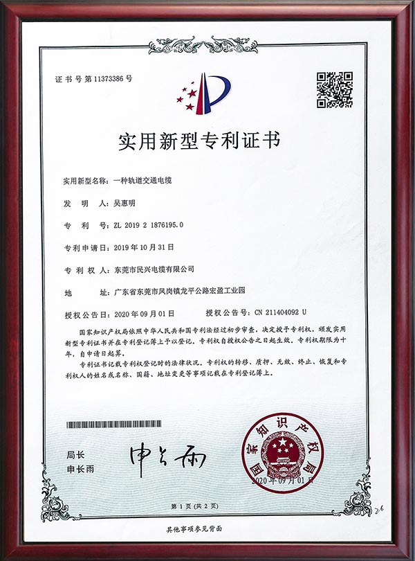 • 专利证书-一种轨道交通电缆